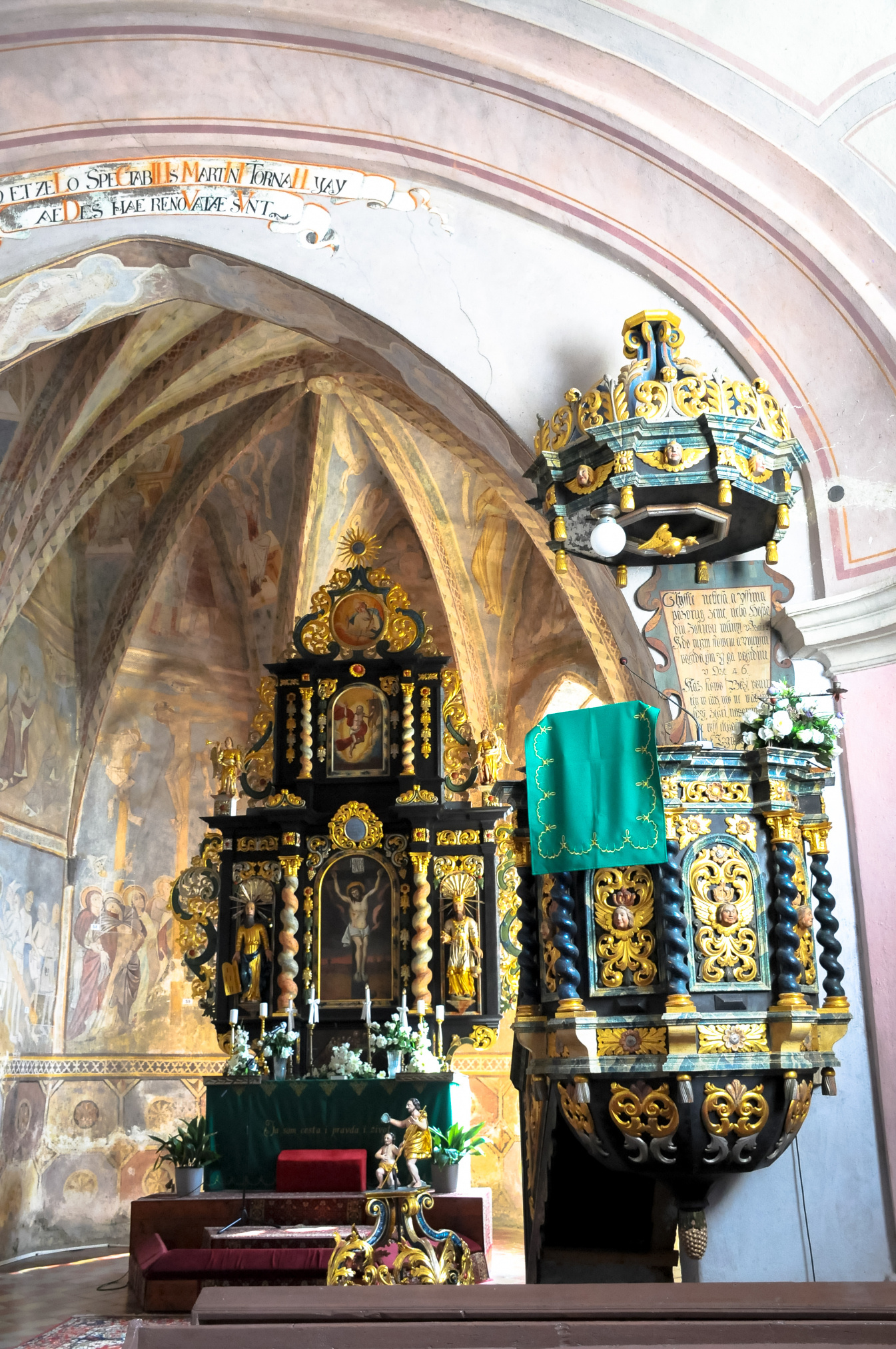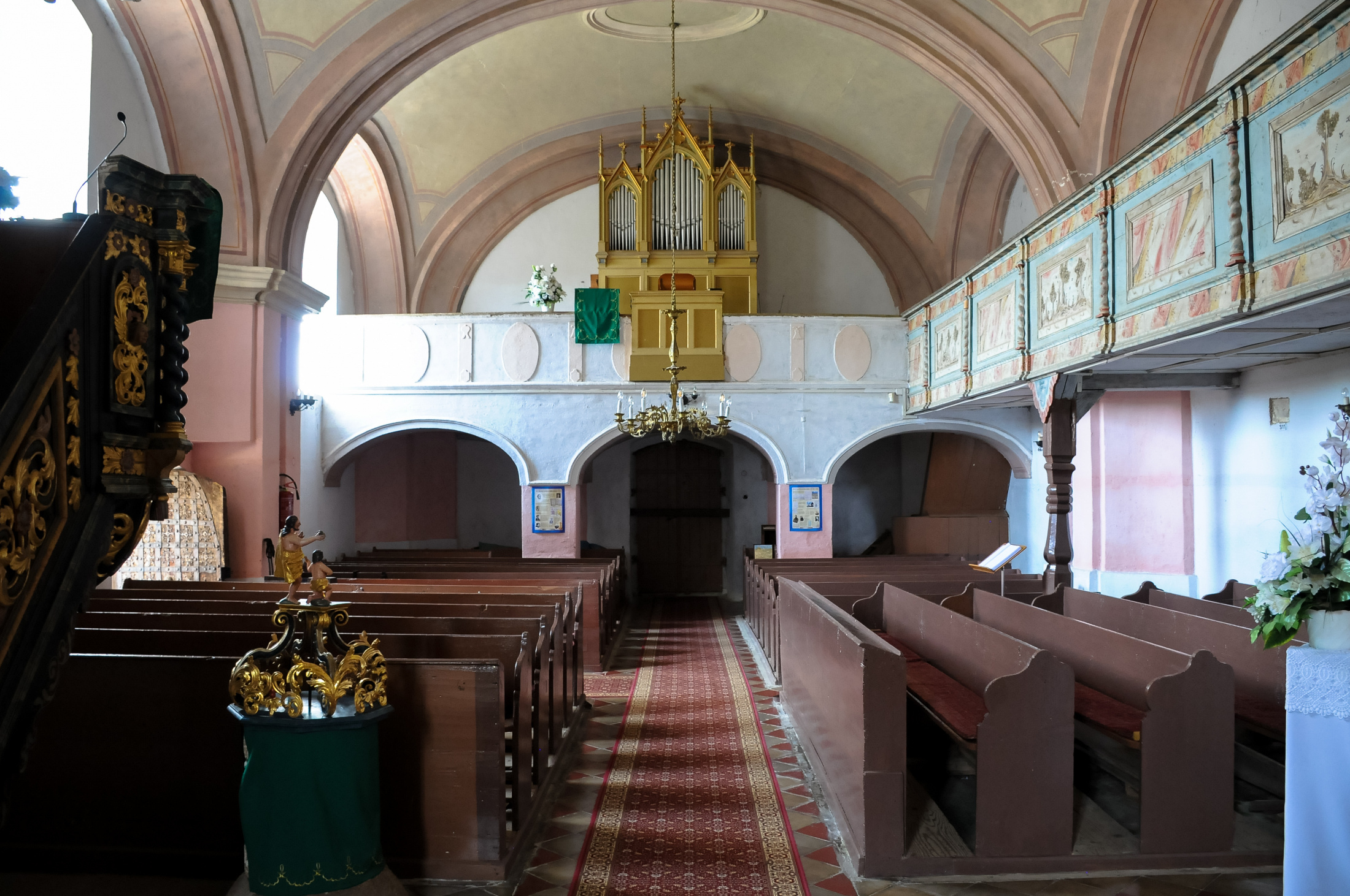 Empora v lodi je zdobená ľudovou štylizovanou maľbou zo začiatku 18. storočia. Okrem empory a truhlice mobiliár kostola pochádza z 18. storočia a je kvalitnou rezbárskou prácou domácej dielne. V roku 1908 bol do kostola zavedený organ. Začiatkom 20. storočia bola celá fresková výzdoba odrytá budapeštianskym profesorom Ištvánom Grohom a následne reštaurovaná, čo však značne premenilo pôvodný vzhľad malieb premaľbami. Podľa výskumu možno vznik malieb vymedziť rokmi 1360 – 1370. Potvrdila sa aj existencia ďalších neodkrytých malieb.